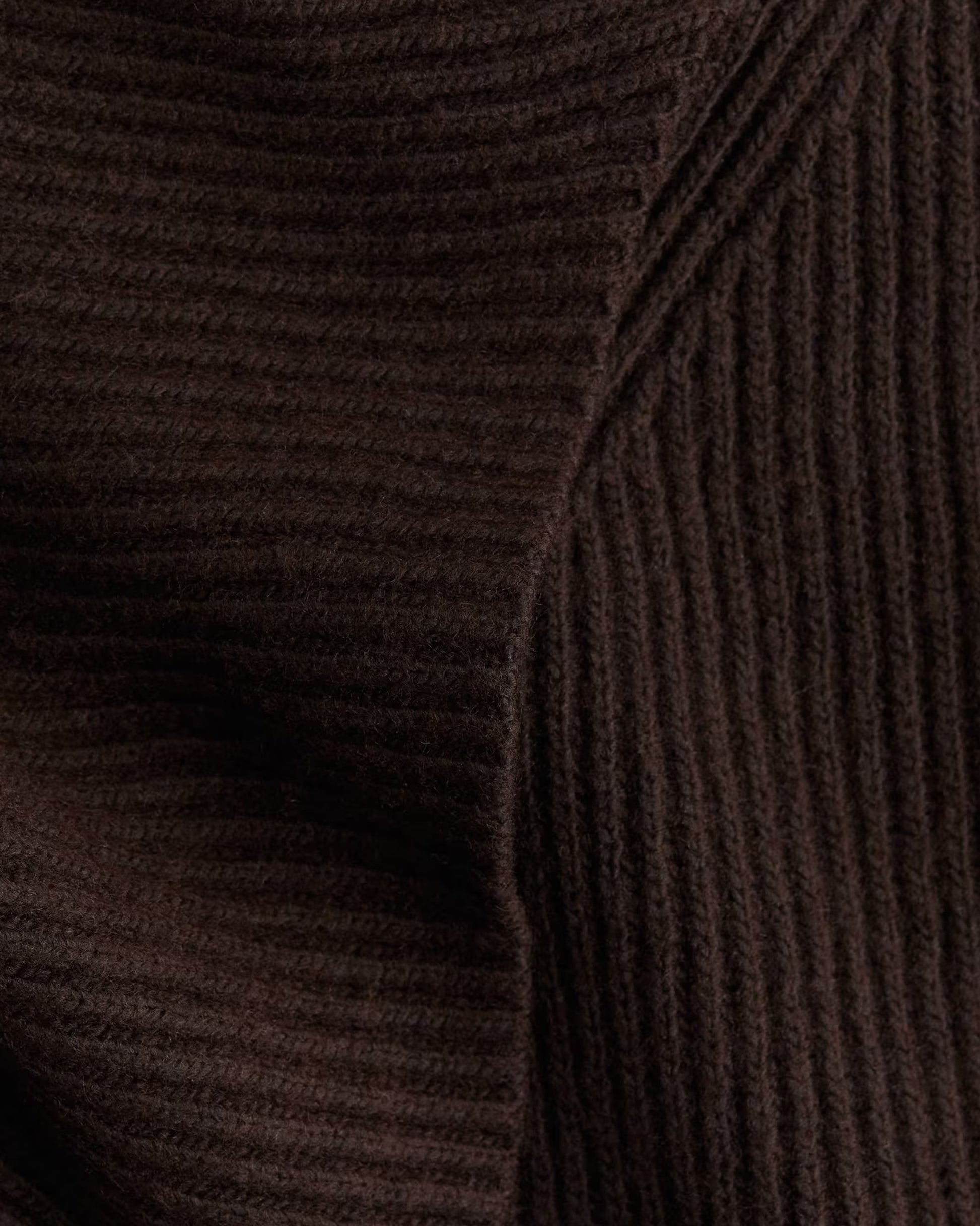 Een ribgebreide trui van een zachte kwaliteit met een ruime pasvorm. De trui heeft een sjaalkraag, verlaagde schoudernaden en lange mouwen. De trui heeft een losse fit.