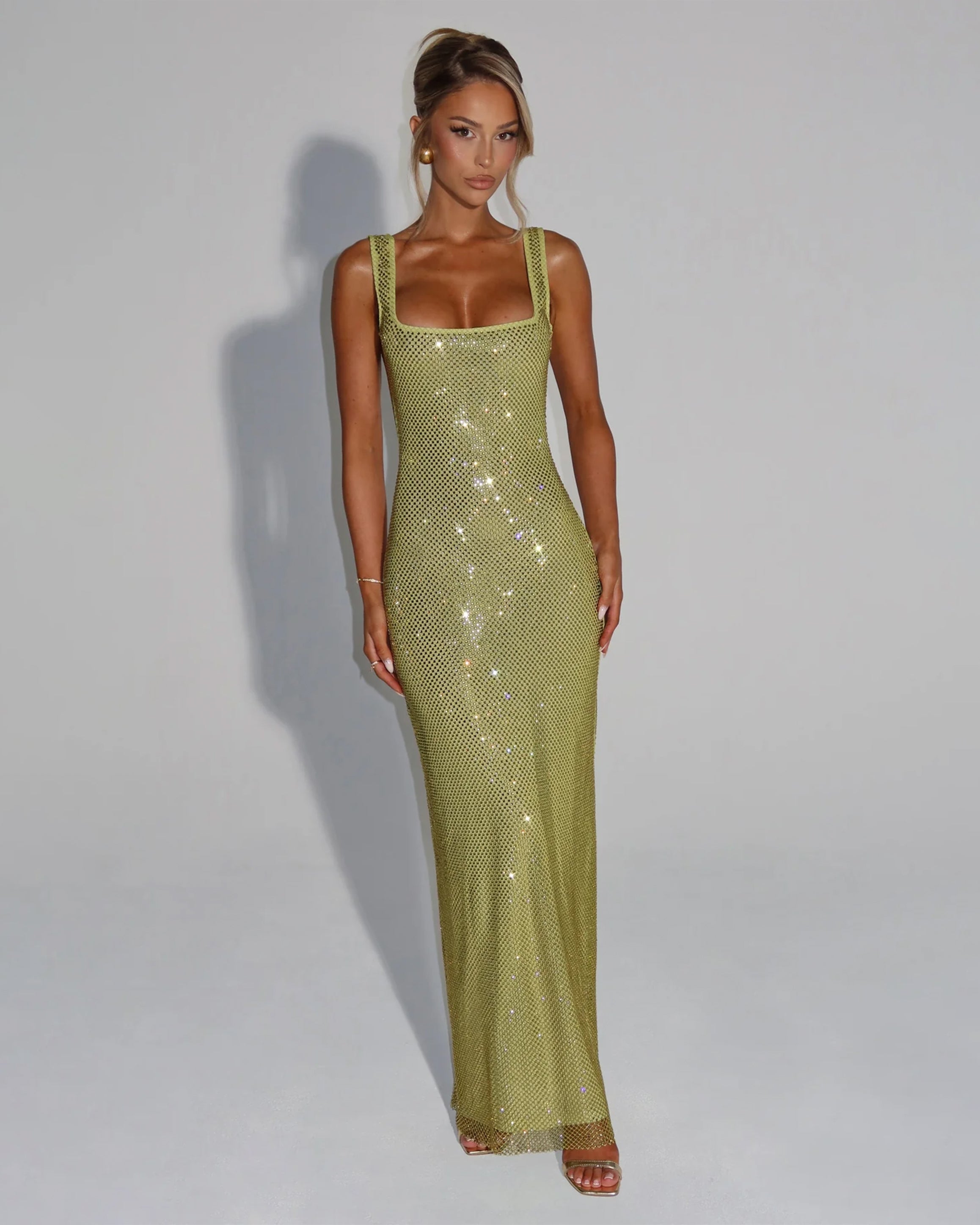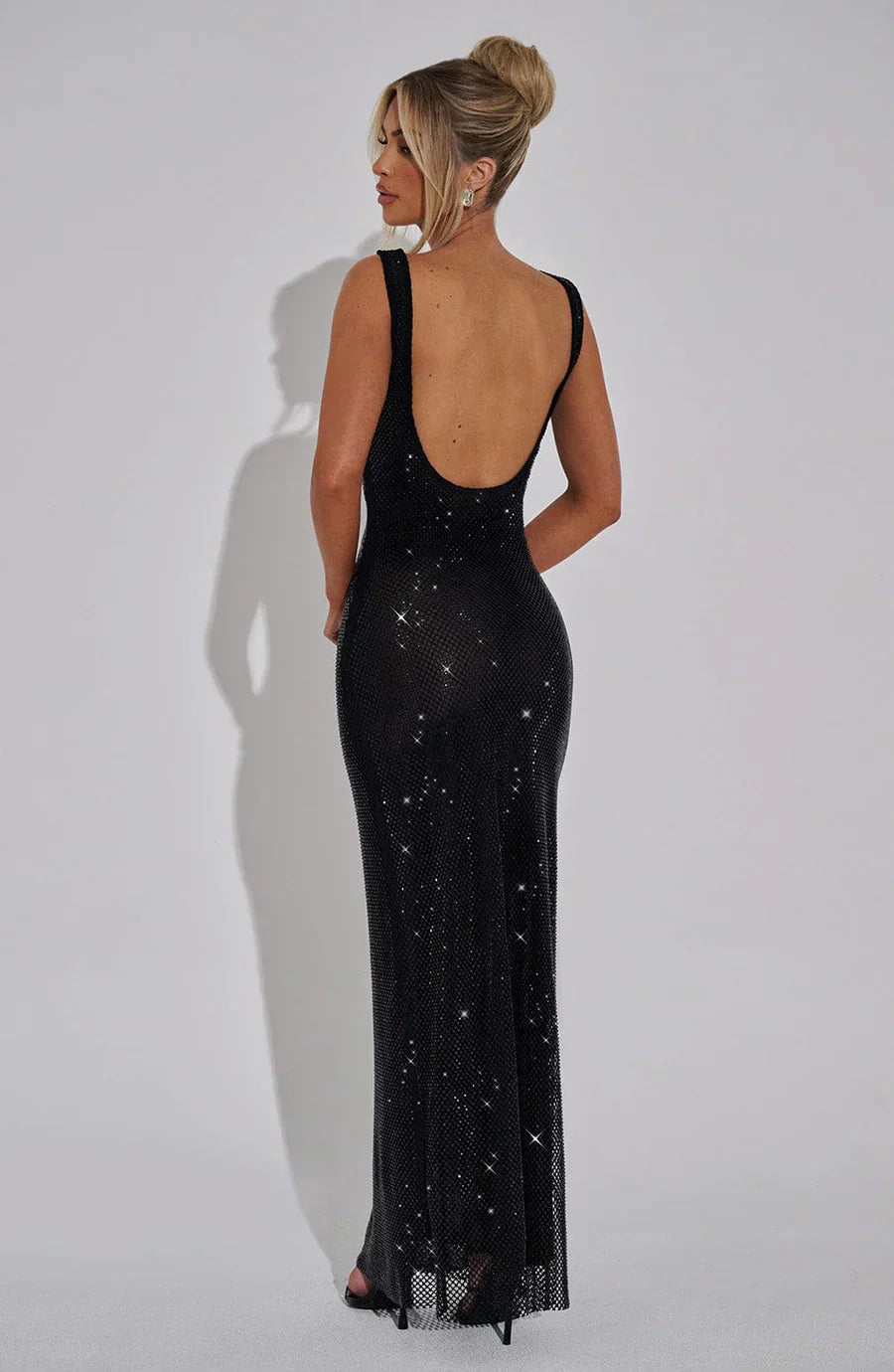 Maak kennis met Dori, de ultieme show-stopping maxi dress die je vanuit elke hoek laat stralen. De jurk is gemaakt van zachte stretch mesh en volledig versierd met rhinestones, waardoor een schitterend semi-sheer effect ontstaat dat het lichaam op precies de juiste plekken omarmt. Met een strakke square neckline en een lage scoop back is Dori gemaakt voor onvergetelijke entrances — welke kleur je ook kiest.