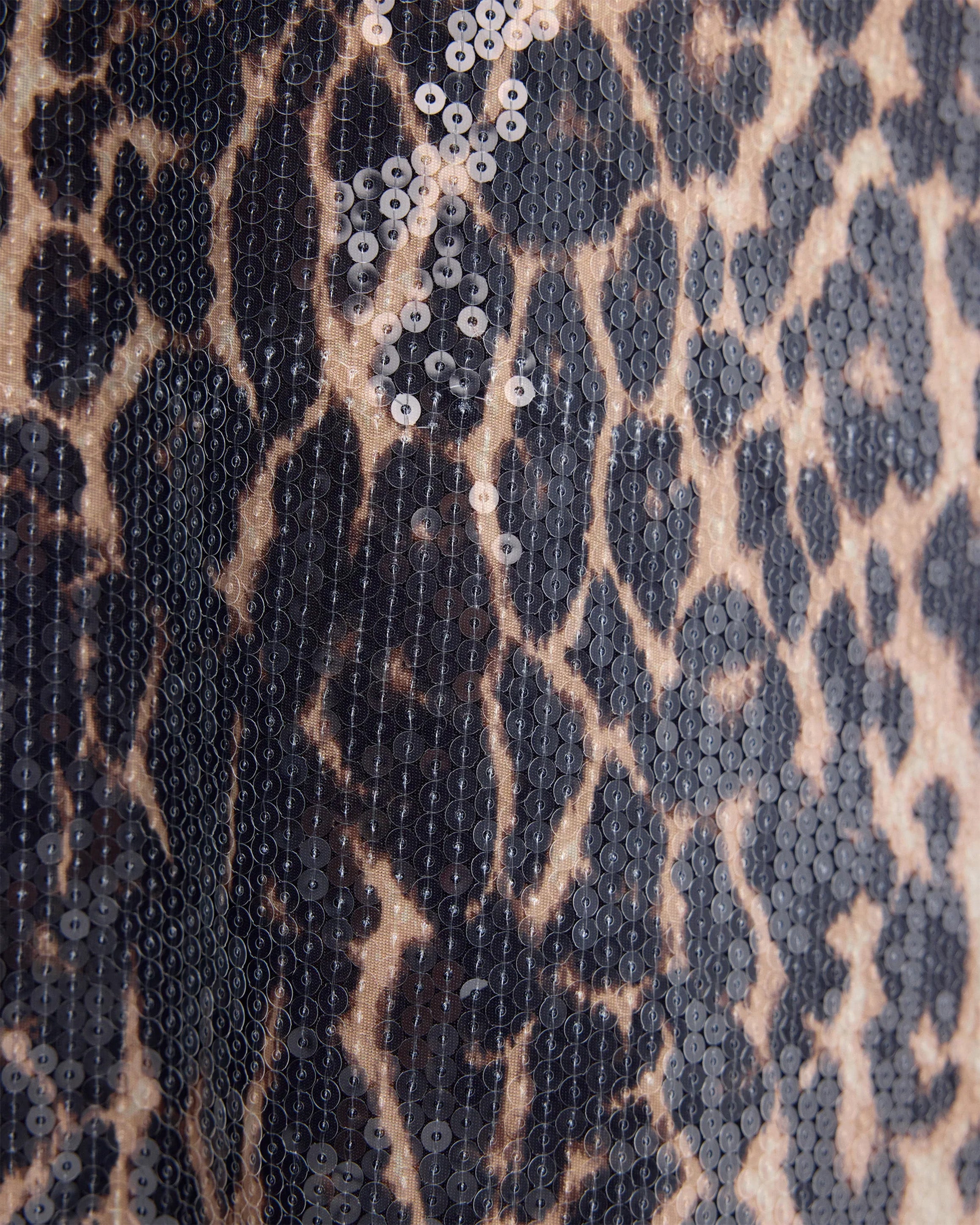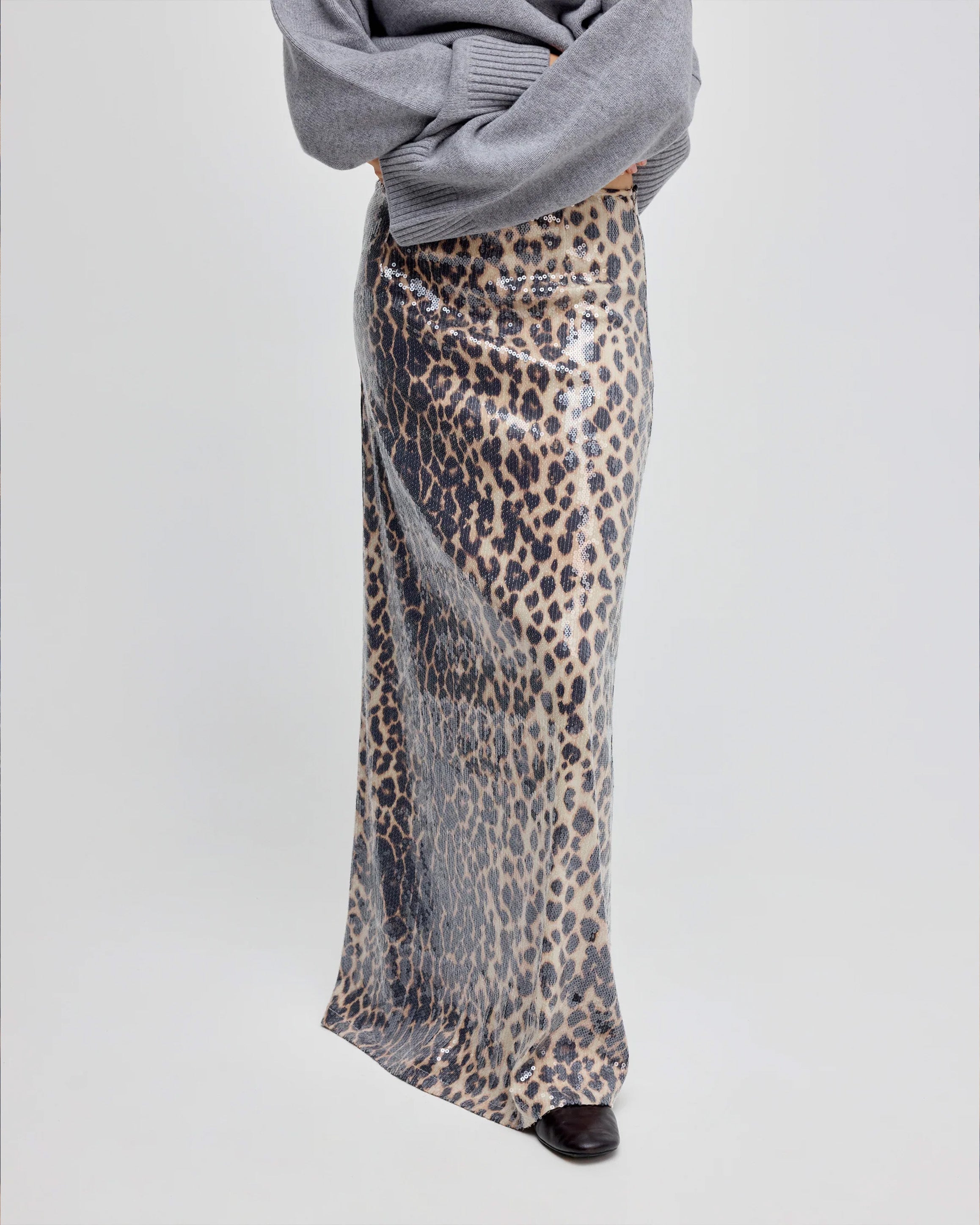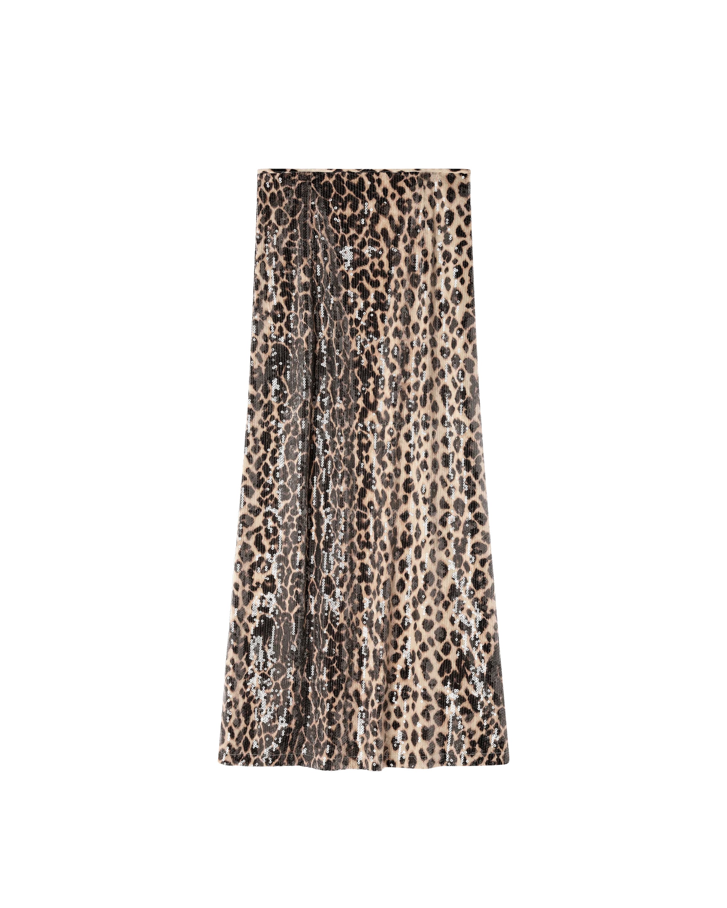 Deze maxi-rok met luipaardprint in pailletten combineert tijdloze elegantie met een statement-look. De rok is uitgevoerd in een schitterende glinsterende sequin-stof met luipaardprint en valt lang langs het lichaam voor een flatterend en opvallend silhouet. Dankzij de maxi-lengte en subtiele flare beweegt hij prachtig mee bij elke stap, terwijl de onzichtbare rits aan de zijkant zorgt voor een nette afwerking.